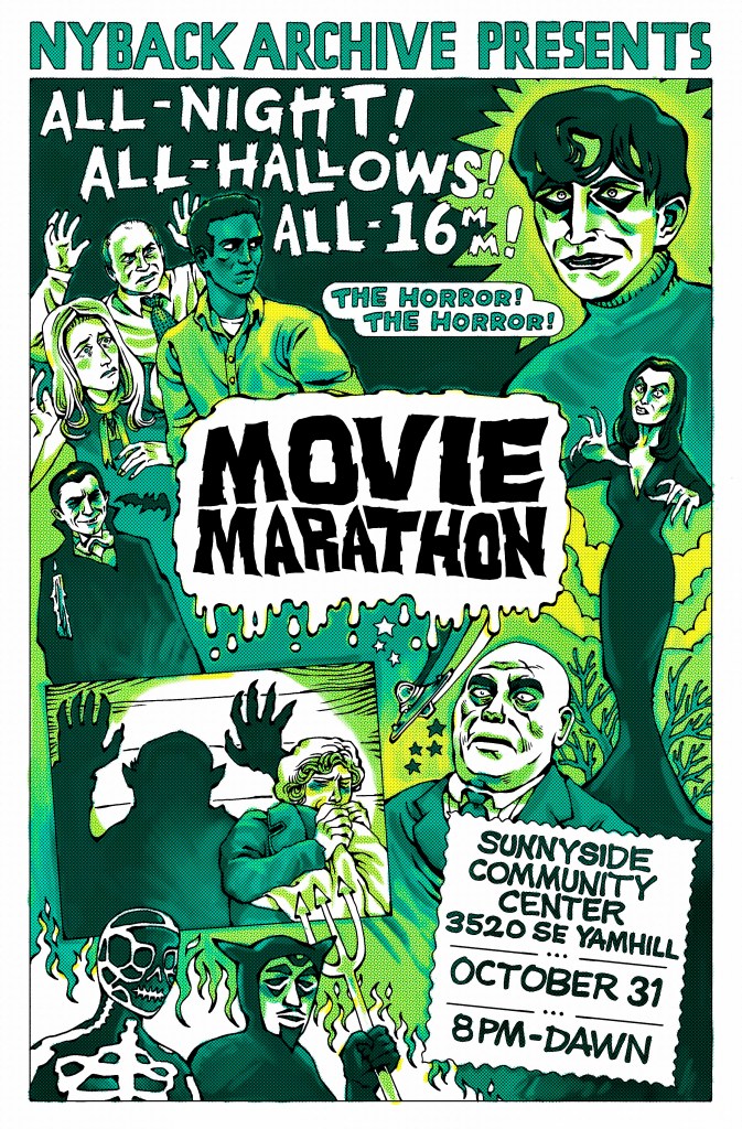 The first annual ALL-NIGHT, ALL-HALLOWS, ALL-16MM MOVIE MARATHON will bring a horrific selection of classic horror and terrifying 16mm ephemera to the hallowed halls of the Nyback Archive.